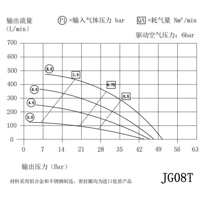 嘉力:技術(shù)參數(shù) Pa=驅(qū)動氣壓 Pi=輸入壓力 Po=輸出壓力 (單位:bar) |
