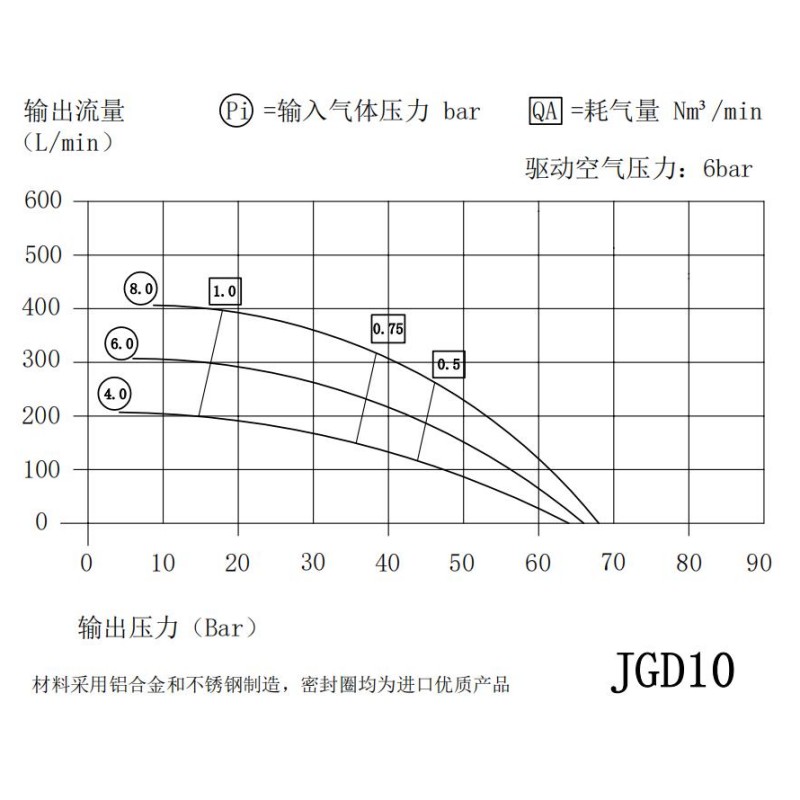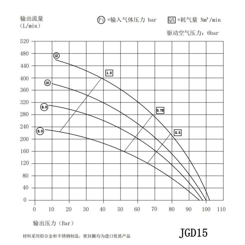 嘉力:技術(shù)參數(shù) Pa=驅(qū)動氣壓 Pi=輸入壓力 Po=輸出壓力 (單位:bar) |