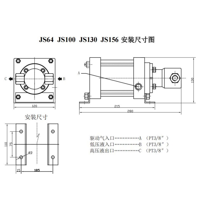 JS130 | 130:1 | 130Pa | 3.5 | 60次/min | PT3/8" | PT3/8" | PT3/8" |